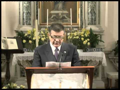 Remarks: (1) Where the text has Fi dal om, the lector reads Fiu di Diu, before correcting himself to read dal om, as per the text. (2) We hear the lector pronounce citât as sitât, also typical of his variant of Friulian. (3) Coragjo: This means take courage, take heart. (4) Une leture dal vanzeli: a gospel reading. This gospel reading was read by a member of the laity, outside of Mass.